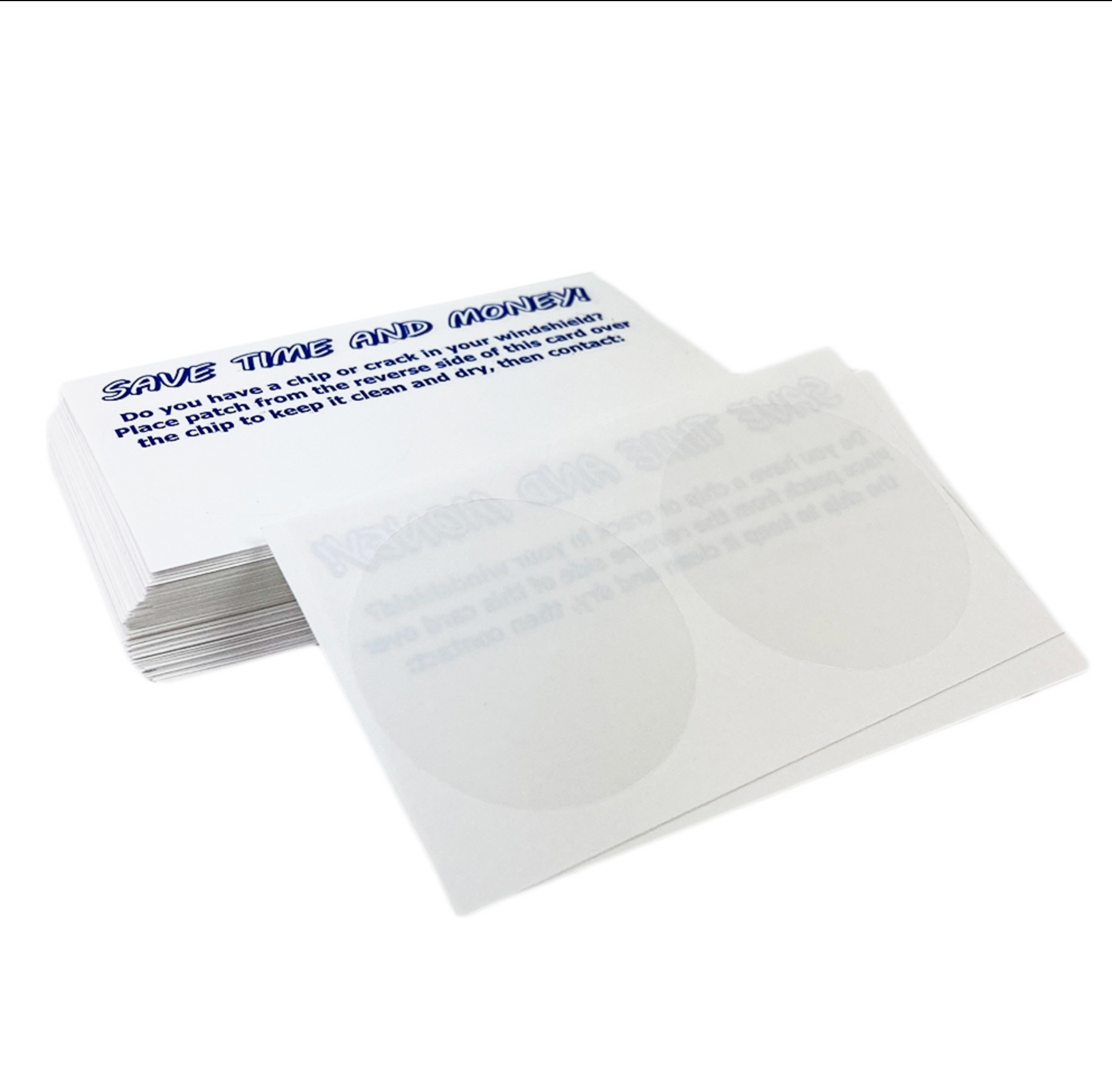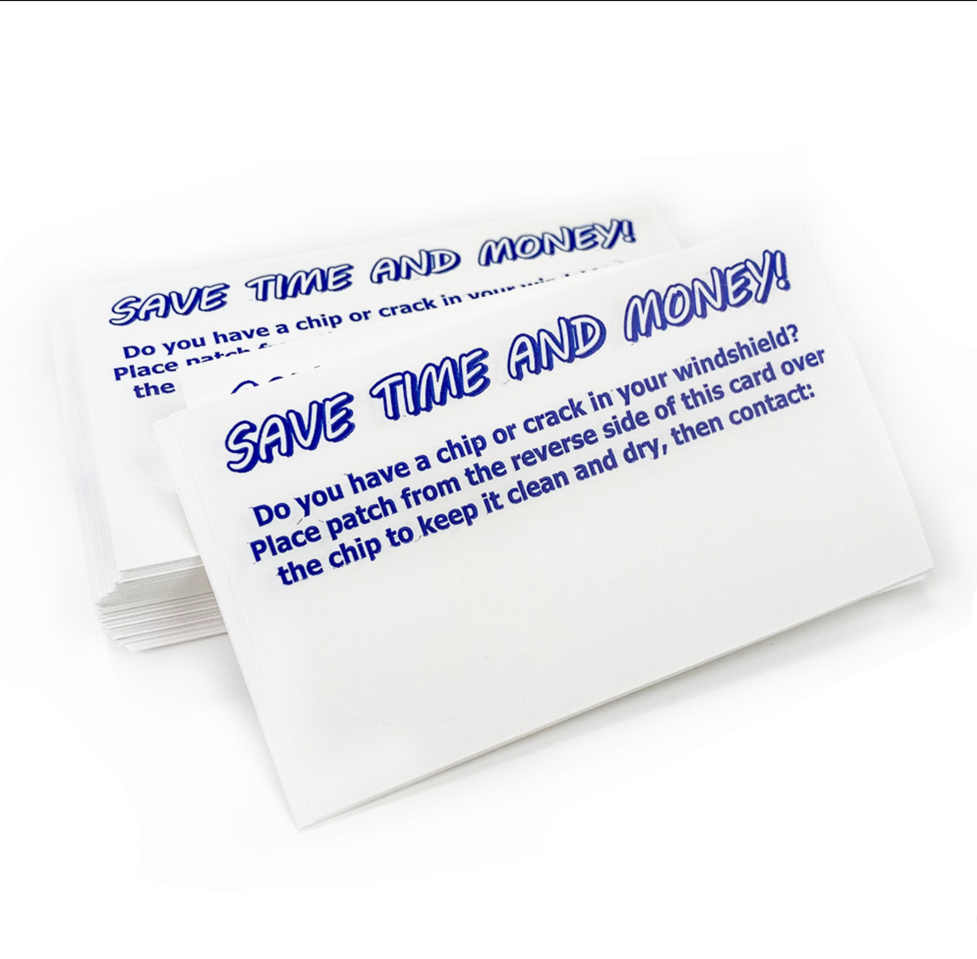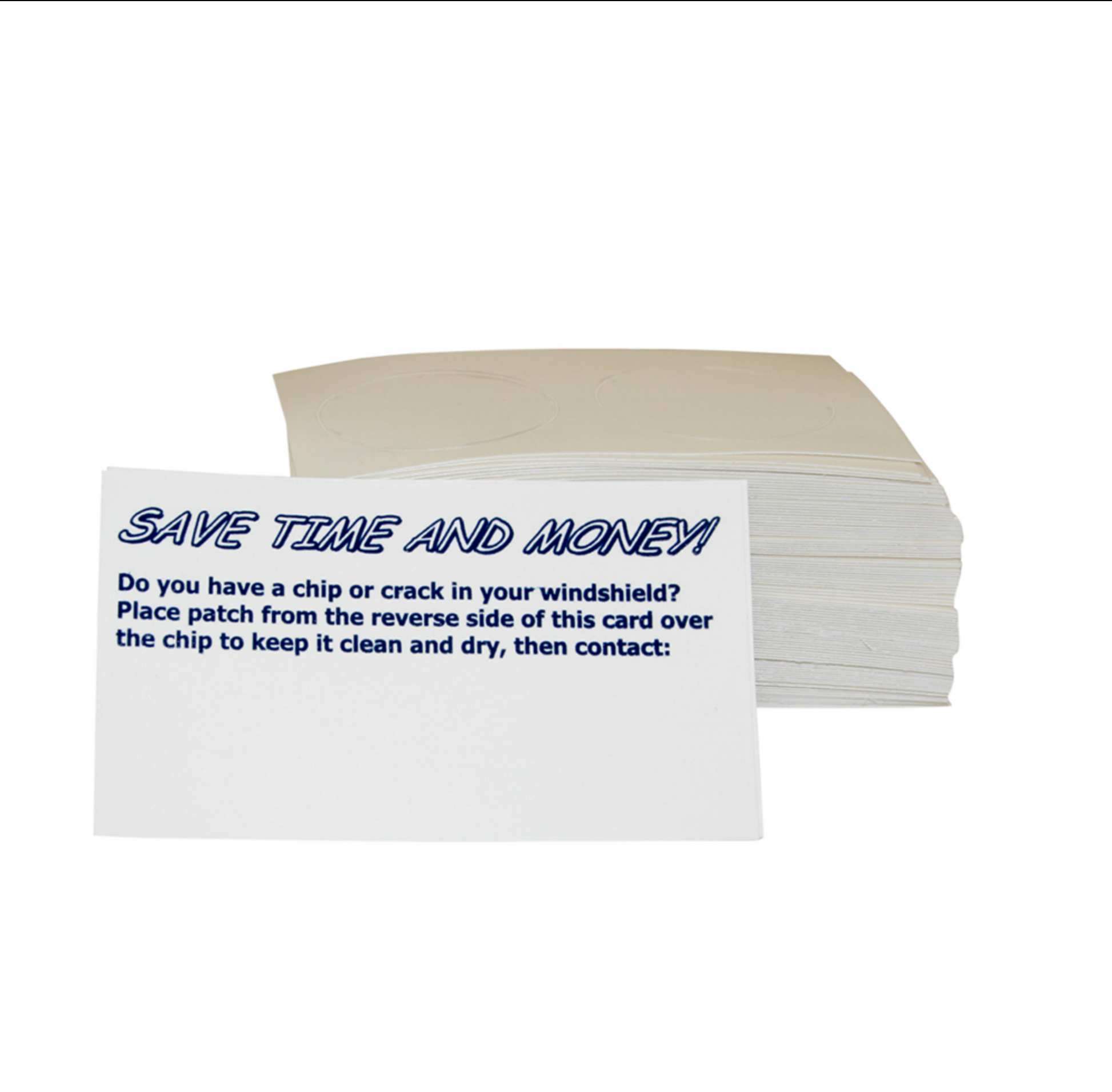 Instruct your customers and prospective customers to cover newly acquired rock chips on their windshields with the small adhesive backed circles on the backside of the card to keep out moisture and contaminates until it can be repaired. Add your company’s name and phone number to the front and use Windshield Chip Savers as your business cards. Insurance agents love to hand out Chip Savers!