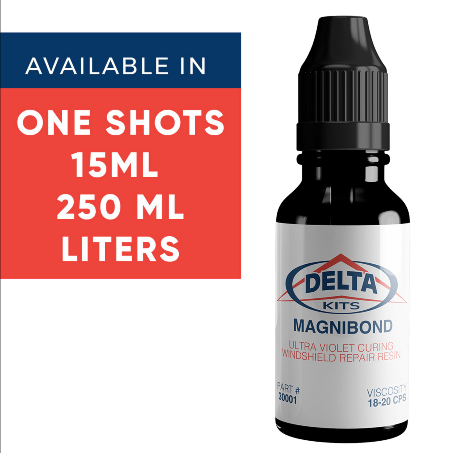 MagniBond windshield repair resin is a professional-grade, low viscosity (18-20 cps) injection resin. The industry favorite for well over a decade. Known as the do-it-all resin MagniBond performs extremely well in all weather conditions and all types of breaks. Independent auto glass repair and replacement professionals worldwide prefer Delta Kits resins over any other brand! Available in One-Shot syringes, 15 ml bottles, money-saving packs of two, 250 ml bottles, and Liter bottles.