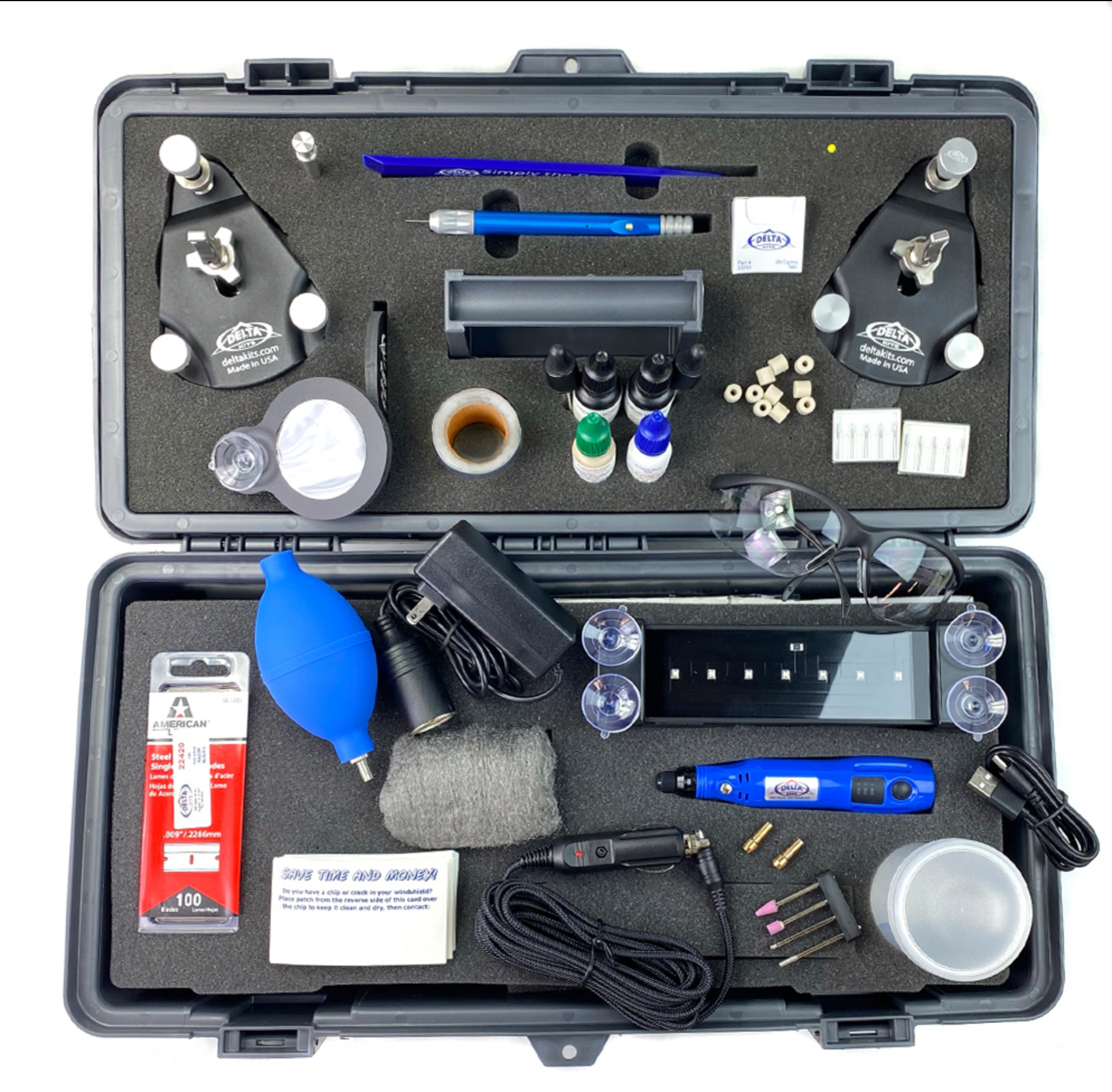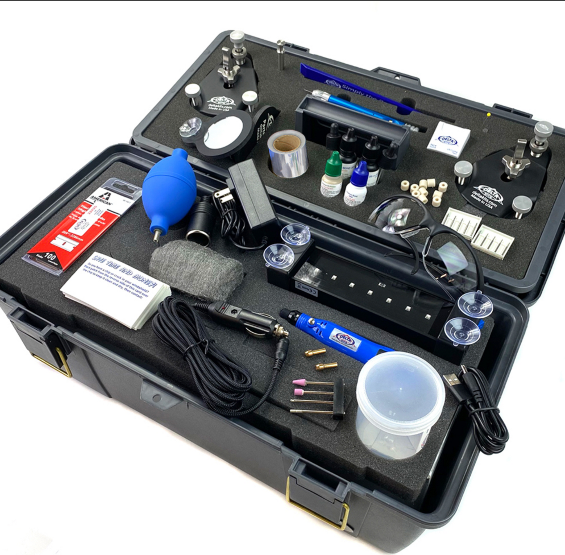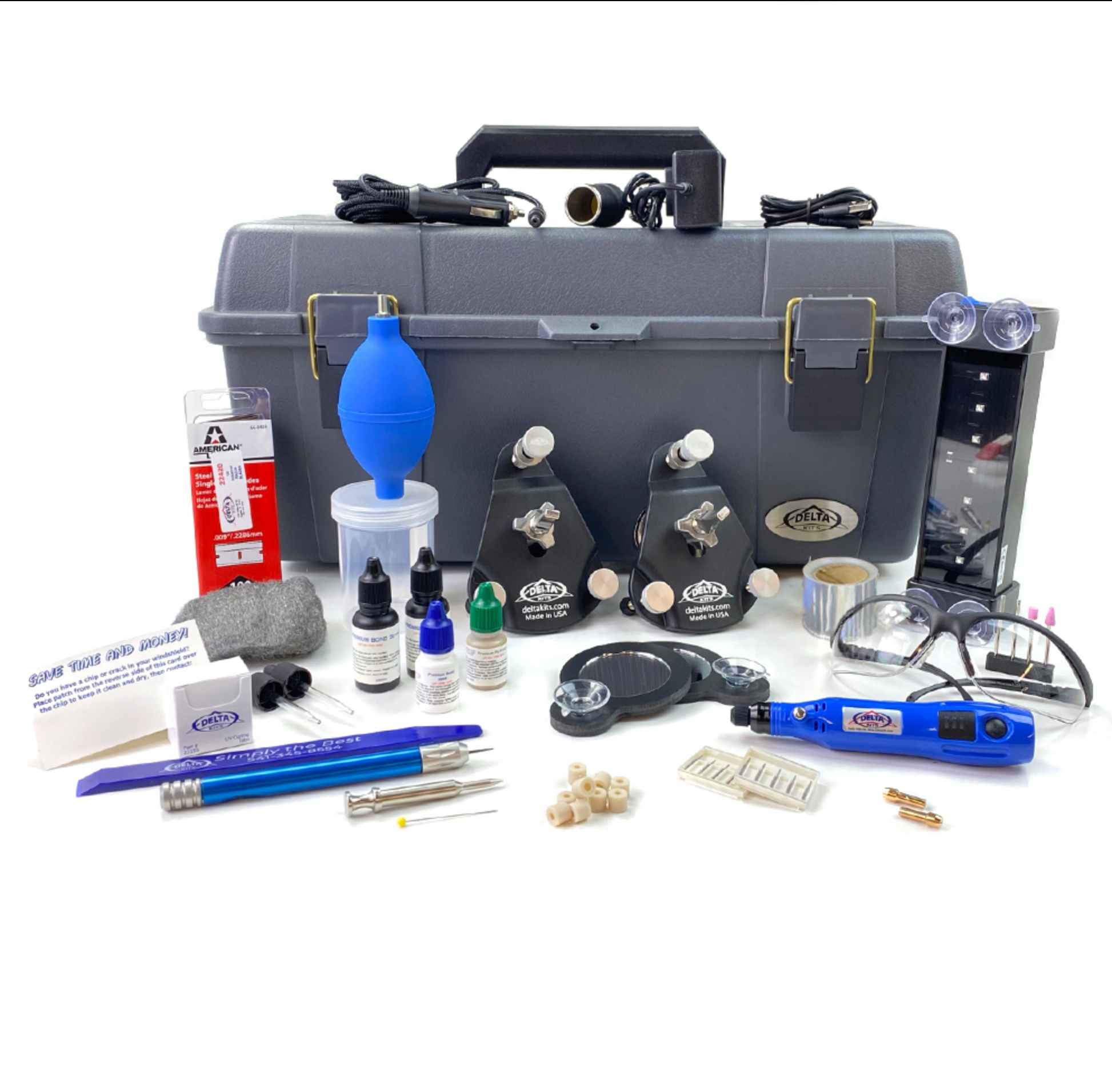 The EZ-350D has more resin, more polish and a plethora of additional equipment not included with any other windshield repair system in its price range. Best of all, you save more money when you purchase this value packed top of the line windshield repair system from Delta Kits. The EZ-350D includes enough supplies to complete up to 100 repairs.